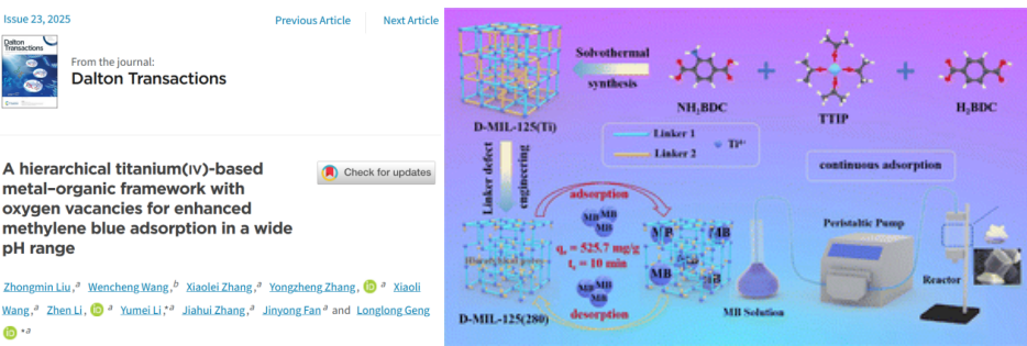近日,化学化工学院刘中敏博士在有机金属化学领域期刊《Dalton Transactions》(中科院二区)发表题为“A hierarchical titanium(iv)-based metal-organic framework with oxygen vacancies for enhanced methylene blue adsorption in a wide pH range”的研究论文。今年会官方网站为第一完成单位,刘中敏博士为第一作者,耿龙龙教授和李玉美教授为通讯作者。该研究得到了福州大学王文成教授的指导。