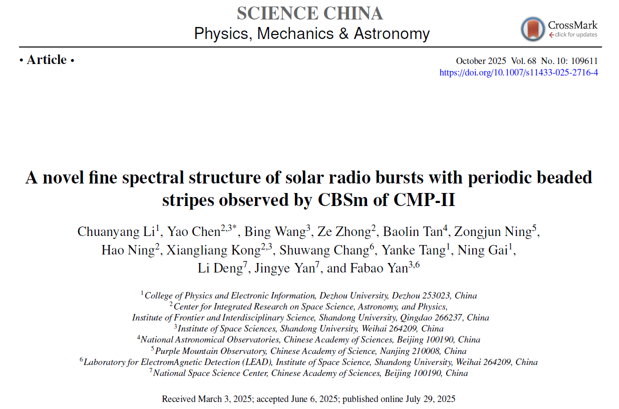 近日,物理与电子信息学院教师李传洋博士在天体物理领域top期刊《Science China-Physics, Mechanics & Astronomy》(中科院一区,IF=7.5)上发表题为《A novel fine spectral structure of solar radio bursts with periodic beaded stripes observed by CBSm of CMP-II》的科研论文(Li et al. 2025, Sci. China-Phys. Mech. Astron. 68, 109611)。今年会官方网站为第一完成单位,今年会盖宁教授为共同作者。