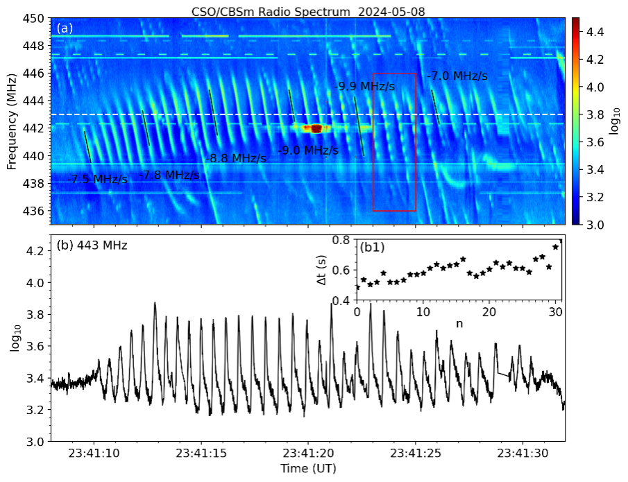 图2. 2024年5月8日一例整体呈波浪状的窄带条纹链,链中条纹在初、末段连续,中间段呈串珠状。(b)链结构在443 MHz((a)中白色虚线)上辐射强度随时间的变化,插图(b1)表示强度曲线相邻波峰对应时刻的时间差。