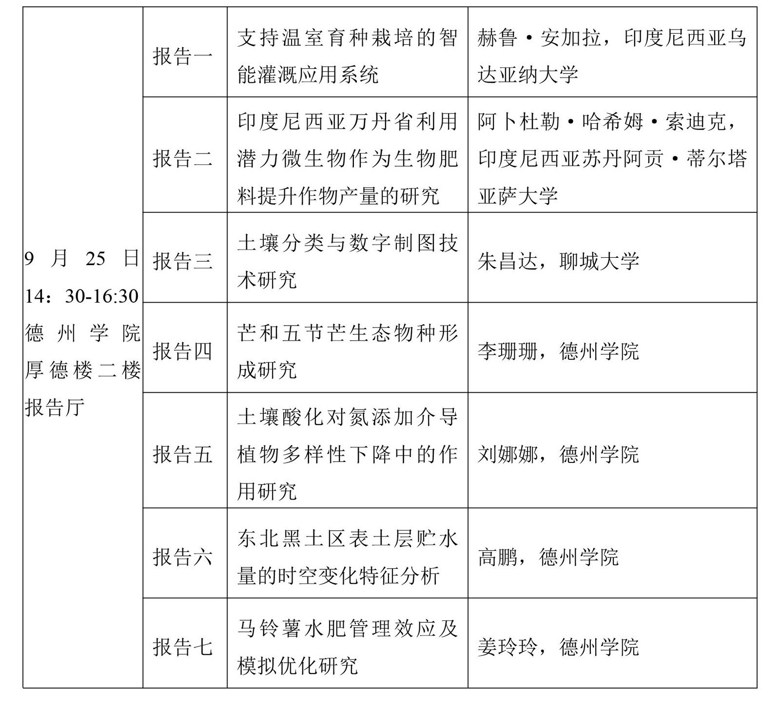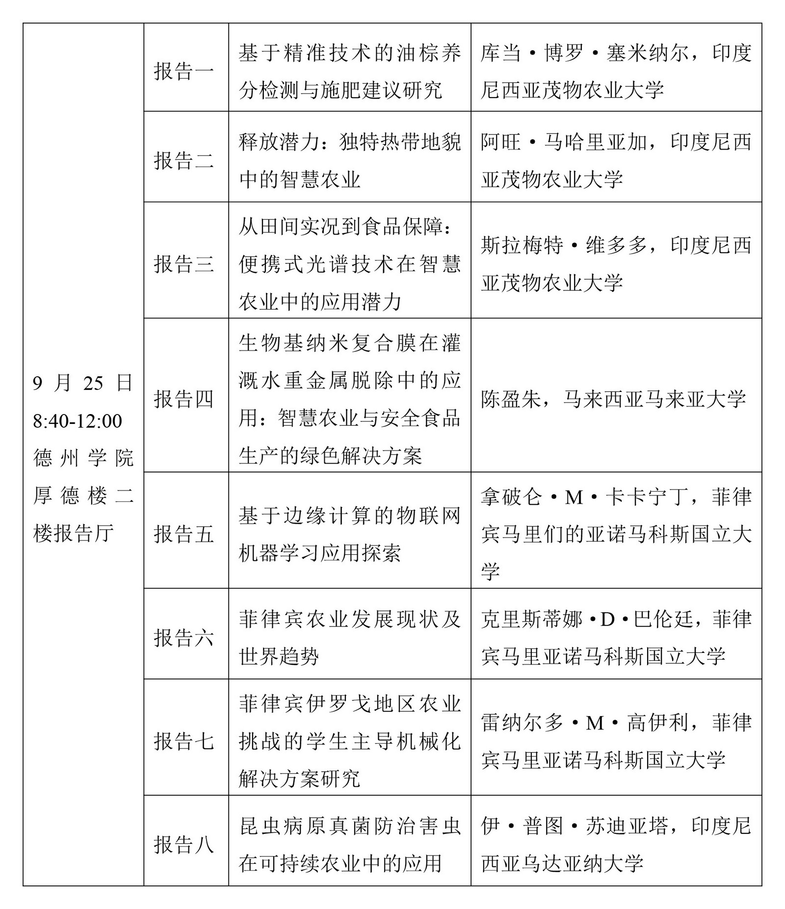 会议主题:会议以“智慧农业创新发展”为主题,会议将围绕智慧农业技术与装备、绿色食品与营养健康、农业大数据与应用、资源利用与可持续发展等研究方向,汇聚中外专家学者,共同探讨智慧农业领域的前沿技术、创新应用以及产业发展趋势,促进科研合作与成果转化。会议将安排大会报告,预计参会人数100人。诚邀全校相关学科、专业师生参加会议。报告题目如下: