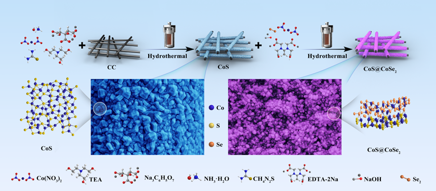 电解水制氢是绿色氢能规模化的关键,但阳极析氧反应动力学缓慢严重制约其效率。本研究针对单一金属硫属化合物催化剂活性不足等问题,提出“外延生长异质结工程”新策略,在CoS表面外延生长CoSe2纳米棒,构建了CoS@CoSe2异质结。该催化剂在碱性条件下仅需115 mV过电位即可达到10 mA cm-2的电流密度,且稳定性优异。DFT计算表明,异质结通过调控界面电荷与电子结构,优化OH- 吸附并降低反应能垒,显著提升了催化剂的析氧性能。