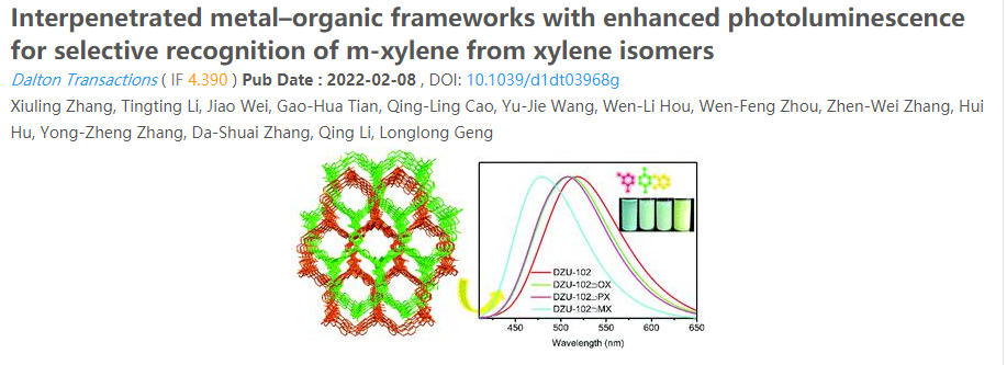 成果二:该工作通过调控反应体系中水的用量,合成了两种基于相同混合配体的层-柱发光MOFs (DZU-101和-102)。其中,DZU-102的互穿骨架和合适的孔径使其成能够识别检测二甲苯同系物,并且基于结构模拟计算,解释了作用机理。