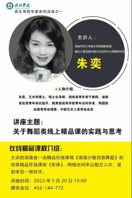 为进一步提高音乐学院精品课程的建设水平,增强教师的教科研能力,拓展学生学科前瞻视野。音乐学院特邀请湖南师范大学朱奕教进行线上专题讲座《关于舞蹈类线上精品课的实践与思考》。