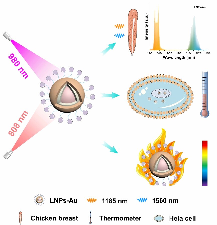 2022年10月6日,今年会山东省生物物理重点实验室许士才教授带领研究团队和吉林大学付作岭教授合作研制出兼有光热治疗和测温特性的镧系纳米粒子和纳米金复合探针(LNP-Au),提出可以在光热治疗的同时同步进行精准的非接触温度检测方法,实现了温度精确控制下的光热治疗,从而实现高效的光热治疗并有效降低对肿瘤周围正常组织的损伤。上述研究以“Robust emission in near-infrared II of lanthanide nanoprobes conjugated with Au (LNPs-Au) for temperature sensing and controlled photothermal therapy”为题发表在《Chemical Engineering Journal》(IF= 16.744)。为了解决传统光热探针活性差和原位温度测量不准确的问题,本研究将镧系纳米粒子(LNP)与纳米金(Au)进行复合,成功研制出LNP-Au复合探针,使之同时兼备了光热治疗和同步测温的功能。掺杂有稀土离子(Yb3+、Ho3+、Er3+和Ce3+)的LNP在近红外二区能够发出强烈荧光,发射峰中心波长在1185 nm和1560 nm,二者强度高度依赖于温度,通过二者强度比产生了极高的测温灵敏度。在近红外光照射下,LNP-Au复合探针与Hela共同孵育后,HeLa细胞的存活率降低到40%以下。进一步的体内实验证明,LNP-Au可显著抑制小鼠肿瘤组织的增殖和发育。通过小鼠器官组织学分析发现该复合探针对小鼠没有产生明显的毒副作用。本研究为实施肿瘤光热治疗提供了一种高效、安全的方法。