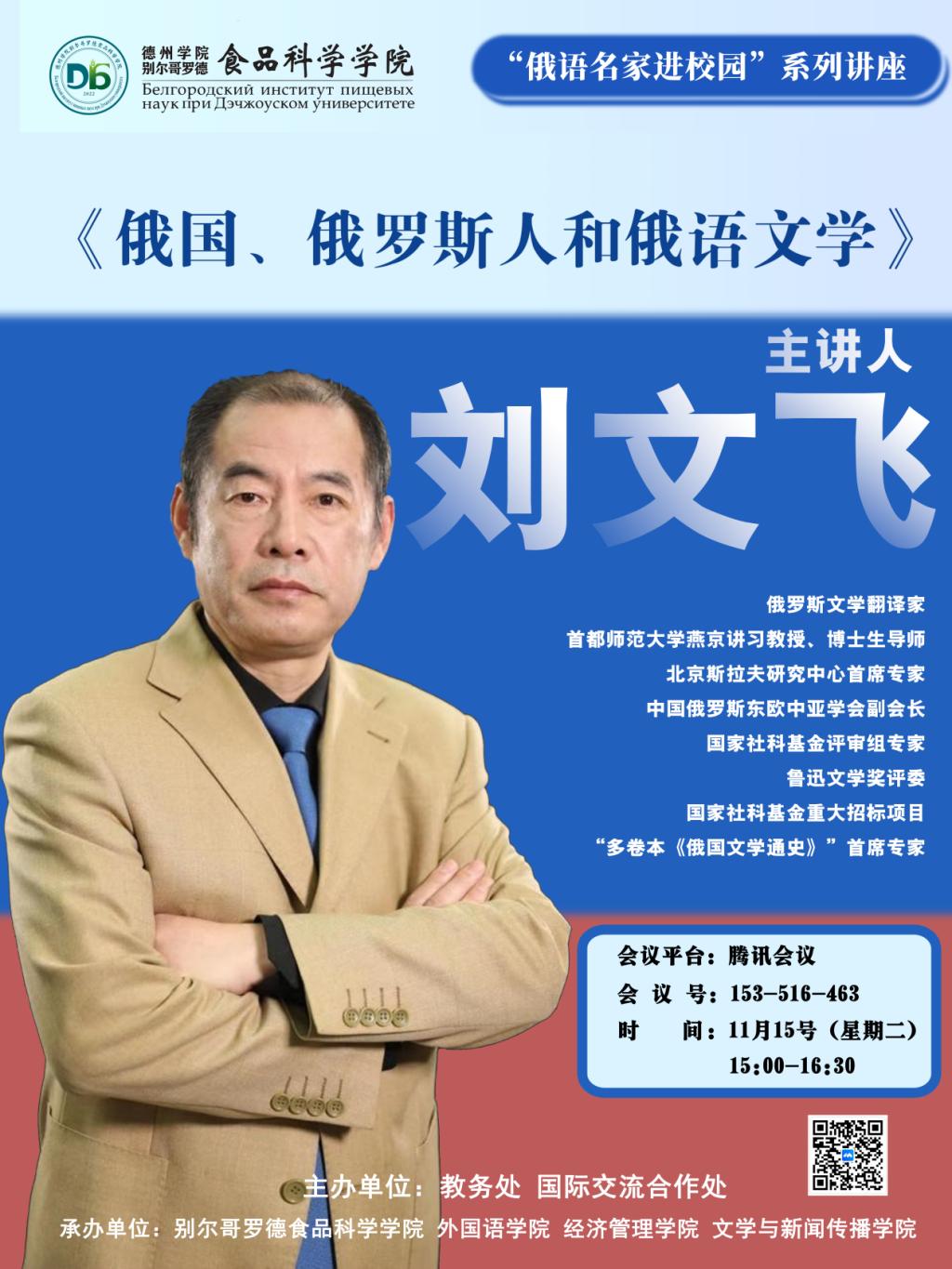 刘文飞,作家,俄罗斯文学翻译家。首都师范大学燕京讲习教授,博导,北京斯拉夫研究中心首席专家,首都师范大学外国诗歌研究中心主任,俄罗斯普希金之家北京分部主任,中国作家协会会员,中国俄罗斯东欧中亚学会副会长,享受国务院政府特殊津贴专家,国家社科基金评审组专家,鲁迅文学奖评委,中国社会科学院职称评审委员会委员,首都师范大学外语学院学术委员会主任,校学术委员会委员,《世界文学》《外国文学》《译林》《俄罗斯文艺》《外文研究》《外国文学研究》《欧亚人文研究》《北京斯拉夫评论》《俄罗斯文学》(俄国科学院俄国文学研究所)《当代国际诗坛》等杂志编委,美国耶鲁大学富布赖特学者,俄罗斯利哈乔夫院士奖、“阅读俄罗斯”翻译大奖、“莱蒙托夫奖”、俄联邦友谊勋章获得者,入选中俄人文交流十大杰出人物。主要著作有《二十世纪俄语诗史》《诗歌漂流瓶》《墙里墙外》《红场漫步》《明亮的忧伤》《阅读普希金》《布罗茨基传》《伊阿诺斯,或双头鹰》《别样的风景》《插图本俄国文学史》《普里什文面面观》《文学的灯塔》《俄国文学的有机构成》《俄国文学演讲录》《追寻大师的足迹》《白银时代的星空》《俄国文学文化论集》《俄国文学新论》等二十余部,主要译著有《普希金诗选》《俄罗斯文化史》《俄罗斯侨民文学史》《三诗人书简》《“百事”一代》《萨宁》《俄罗斯美女》《抒情诗的呼吸》《俄国文学史》《曼德施塔姆夫人回忆录》《刘文飞译文自选集》《悲伤与理智》等四十余部,发表论文三百余篇。译著《曼德施塔姆夫人回忆录》《悲伤与理智》先后入选“年度十大好书”榜,曾获“十月文学奖”“陈子昂诗歌翻译奖”“袁可嘉诗歌翻译奖”“俄罗斯十月文学奖”“国家图书馆文津图书奖”等多种国际国内文学奖,有散文多篇入选年度最佳散文。近年主要从事俄国文学史和俄国思想史研究 目前任国家社科基金重大招标项目“多卷本《俄国文学通史》”首席专家。