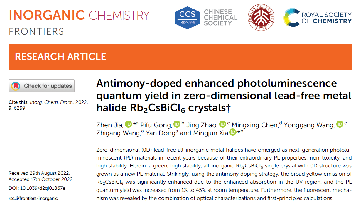 近日,化学化工学院新型无机材料团队贾贞教授等与中国科学院理化技术研究所夏明军研究员合作,从固体化学角度出发,围绕金属卤化物结构设计原则,通过引入锑离子调控单晶的结构带隙,促进激子自陷的发生,构筑了高效宽带的黄光零维金属卤化物单晶,其室温发光量子效率可达45%。相关成果以“Antimony-doped enhanced photoluminescence quantum yield in zero-dimensional lead-free metal halide Rb2CsBiCl6 crystals”为题发表于期刊《Inorganic Chemistry Frontiers》(IF:7.779,中科院一区,TOP期刊),该期刊由中国化学会、北京大学化学与分子工程学院和英国皇家化学会联合创办,入选2022年度中国科技期刊卓越行动计划高起点新刊。