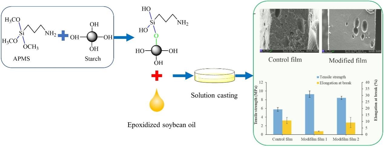 该工作系统地研究了硅烷偶联剂在淀粉与环氧大豆油之间的偶联作用。1)研究了不同NaOH含量下硅烷化淀粉的化学结构、表面形态和结晶度的变化规律。采用3-氨基丙基三甲氧基硅烷(APMS)对淀粉进行修饰,硅烷化处理破坏了淀粉分子内和分子间的氢键相互作用。2)探讨了硅烷化淀粉氨基和环氧大豆油环氧基的作用规律。利用硅烷化淀粉与环氧大豆油通过溶液流延法合成了生物塑料。改性后降解塑料的热稳定性显著提高,拉伸强度从5.78 MPa提高到9.29 MPa。合成的降解塑料可用于代替石油基塑料,用于包装材料中。