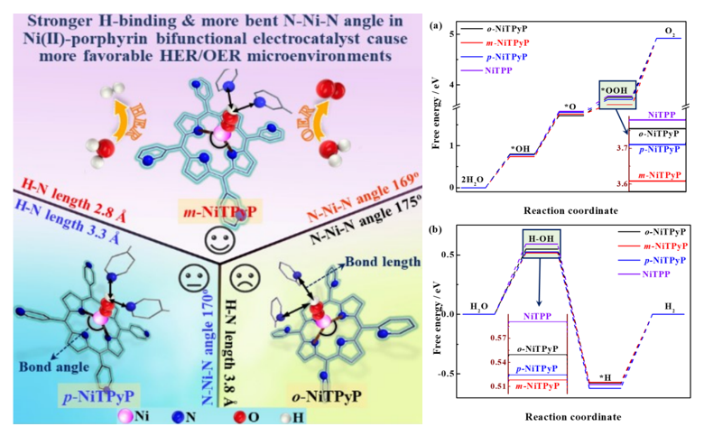 近些年来,通过氢键相互作用调节催化剂界/表面的电子结构和催化活性位点的微环境引起了人们的广泛关注,但至今氢键相互作用对全分解水过程中OER和HER的性能影响机制仍缺乏基本认识。研究发现含吡啶取代基的镍卟啉在电催化过程中兼具OER和HER性能,可以作为双功能电催化剂实现全分解水。发现位于邻位、间位或对位的吡啶N原子对应的Ni(II)-卟啉(o-NiTPyP、m-NiTPyP和p-NiTPyP)表现出不同的催化性能。其中,m-NiTPyP的OER和HER性能最佳。结合理论计算结果对该现象进行分析,发现不同位置的吡啶取代基N原子可通过与供氢中间体(*OOH或H-OH)形成不同强度的H键相互作用,进而调控活性位点周围微环境发生微妙的变化,从而影响全分解水性能。该研究表明,通过合理的调节镍卟啉体系中吡啶N的位置可以研究H键对催化活性位点的微环境的影响。结果发现m-NiTPyP中吡啶N原子与*OOH和H-OH基团中H原子的结合效果越好,N-Ni-N键角越弯曲,分解水性能越好。也就是说,该Ni(II)-卟啉作为一个良好的模型体系可以用来揭示H键调控的电催化剂微环境对全分解水性能的影响机制。