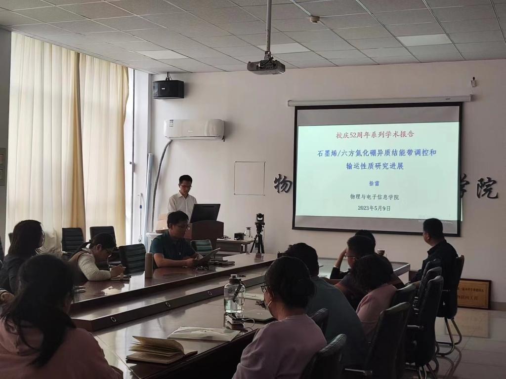 为庆祝校庆52周年,提升教师科研水平,5月9日下午,物理与电子信息学院在启智楼0365会议室举办“校庆52周年系列学术报告——石墨烯/六方氮化硼异质结的能带调控和输运性质研究进展”。物电学院新引进“天山雪松”“天衢英才”徐雷老师为老师们分享相关领域的最新研究进展。