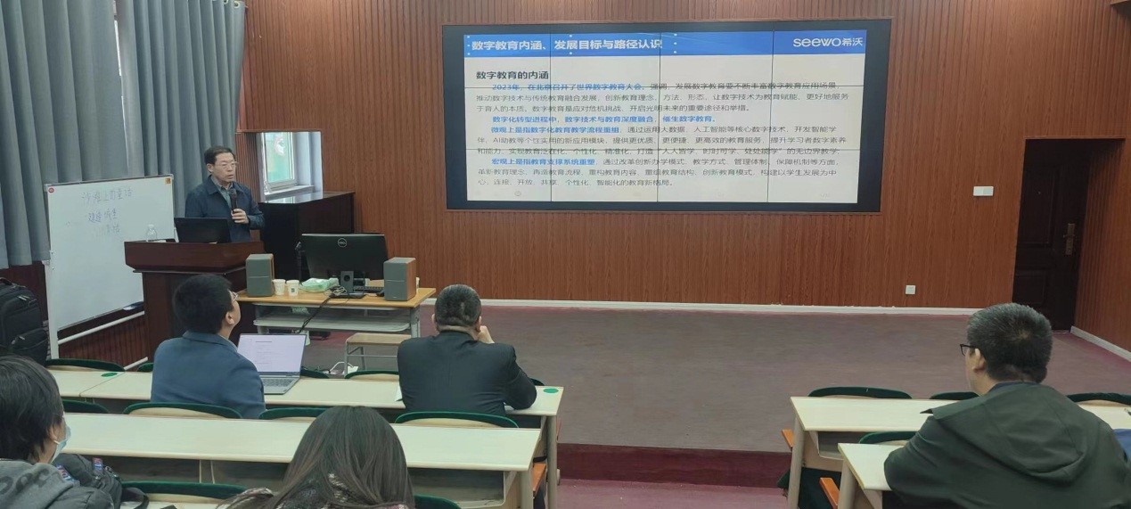 为增强今年会教师数字教育理念、提升数字教育能力,3月13日下午,网络与教育技术中心邀请视源股份未来教育集团(希沃)副总裁、中国高教学会语文教育专业委员会副理事长、中国教育装备行业协会综合实践与劳动专业委员会副理事长、全国地方院校联盟副主席、广东省杏坛智慧教育创新研究院院长魏振水作专题报告。报告会由网络与教育技术中心负责人主持,各教学单位教师代表参加本次报告。