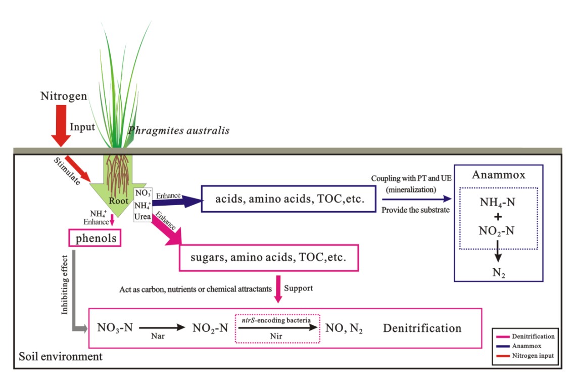 该文章重点揭示了在外源氮添加条件下,黄河三角洲湿地中芦苇根际区土壤的氮转化过程及其生态学调控机制。不同形态的外源氮添加对芦苇根际分泌物的释放具有重要调控作用,其中总糖、氨基酸和总有机碳是根际区反硝化和厌氧氨氧化过程的主要调控因子。外源氮通过促进根系分泌物的释放,进而调控氮净化微生物的活性,从而提升了该区域的氮净化潜力。该研究成果将有助于进一步认知湿地土壤脱氮能力对环境变化的响应,为黄河三角洲湿地生态服务功能的开发及高质量发展提供基础支撑。
