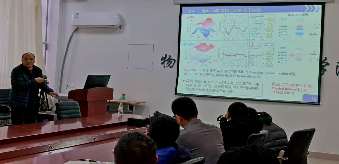 报告会上,段益峰教授从含Cu半导体s-d轨道耦合与非简谐效应谈起,围绕声子、电子输运,介绍了课题组近两年来的主要研究工作,系统梳理了研究选题不断深入拓展的思路,对青年教师从事研究选题有一定的启发作用。段益峰教授与物电学院计算模拟组相关教师就国家基金的申请开展了深入交流,他结合自身多年的申报和评审经历,阐述了申请书撰写的技巧和注意事项。