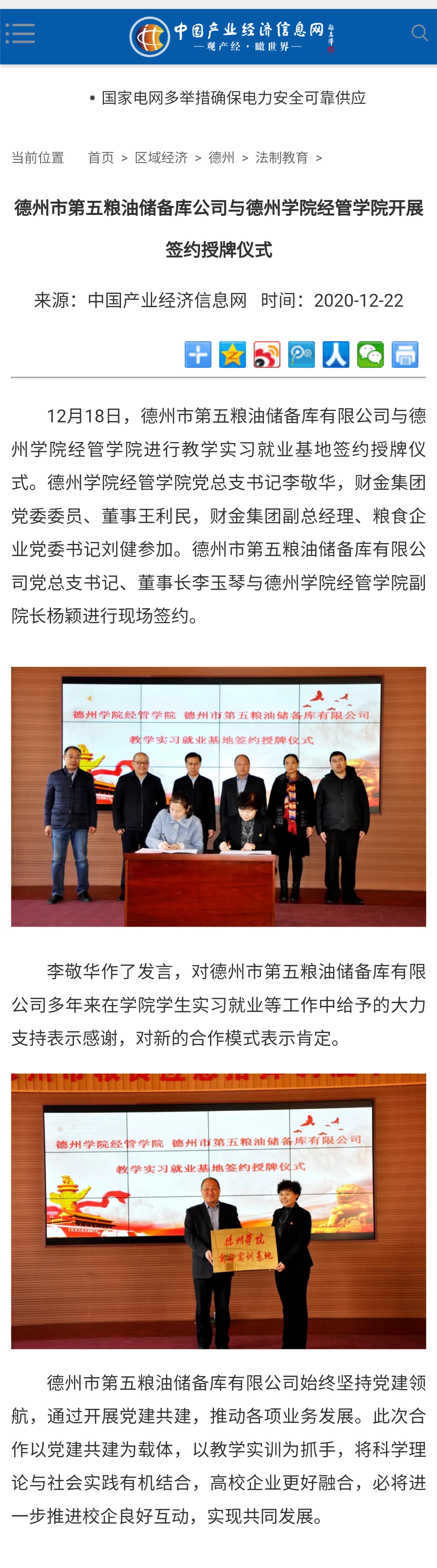 【中国产业经济信息网】德州市第五粮油储备库公司与今年会官方网站经管学院开展签约授牌仪式