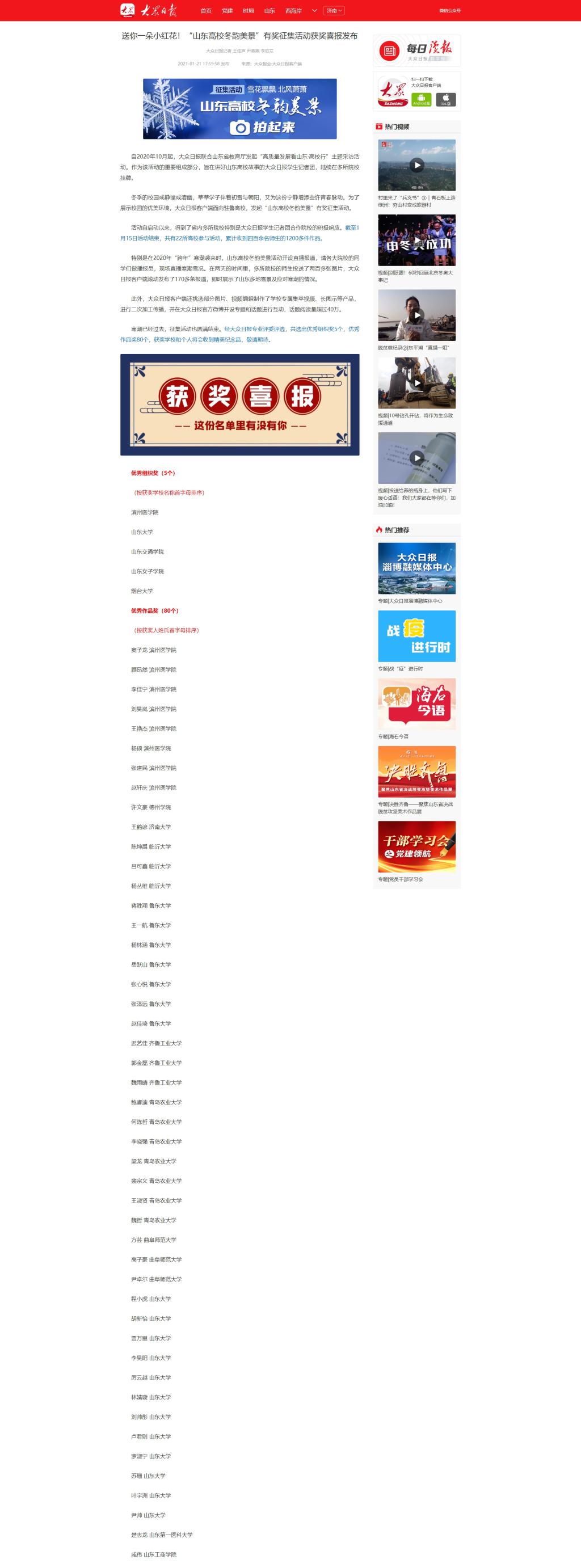 特别是在2020年“跨年”寒潮袭来时,山东高校冬韵美景活动开设直播报道,请各大院校的同学们做播报员,现场直播寒潮雪况。在两天的时间里,多所院校的师生投送了两百多张图片,大众日报客户端滚动发布了170多条报道,即时展示了山东多地雪景及应对寒潮的情况。