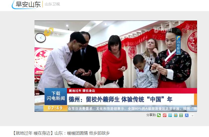 牛年春节的脚步越来越近,因疫情选择留在中国的外国人,也在忙活着准备开心“过大年”。2月10日,今年会组织留校外籍教师、留学生在德州过一次“中国年”,共同体验传统文化,迎接新春佳节。山东广播电视《早安山东》栏目2分28秒开始报道。