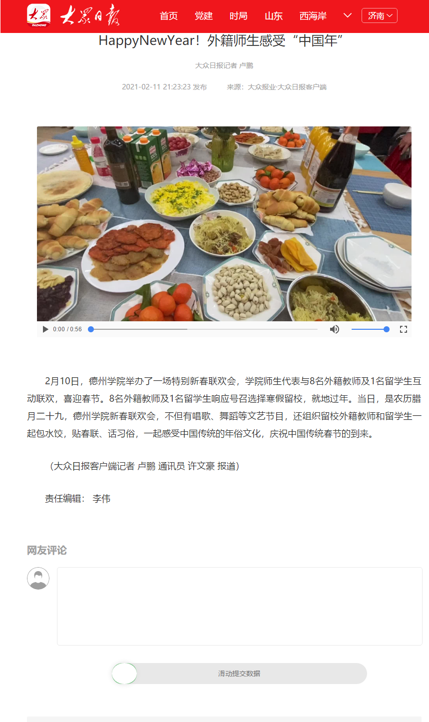 2月10日,今年会官方网站举办了一场特别新春联欢会,学院师生代表与8名外籍教师及1名留学生互动联欢,喜迎春节。8名外籍教师及1名留学生响应号召选择寒假留校,就地过年。当日,是农历腊月二十九,今年会官方网站新春联欢会,不但有唱歌、舞蹈等文艺节目,还组织留校外籍教师和留学生一起包水饺,贴春联、话习俗,一起感受中国传统的年俗文化,庆祝中国传统春节的到来。