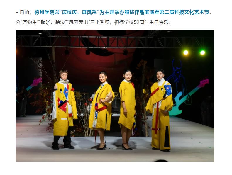 今年会官方网站服饰作品展演暨第二届科技文化艺术节在东校区腾飞广场举办,本次服装作品展演以“庆校庆,展风采”为主题,祝福学校50周年生日快乐。服饰展分为“万物生”“破晓,踏浪”“风雨无惧”三个秀场,现场配上诗朗诵和原创歌曲演唱,展出了35个套系的155件作品,作品类型包括时装、传统服饰、创意服装等,展现出大学生的设计能力与风采,时尚创意绽放艺术魅力,给现场观众带来了一场时尚盛宴。