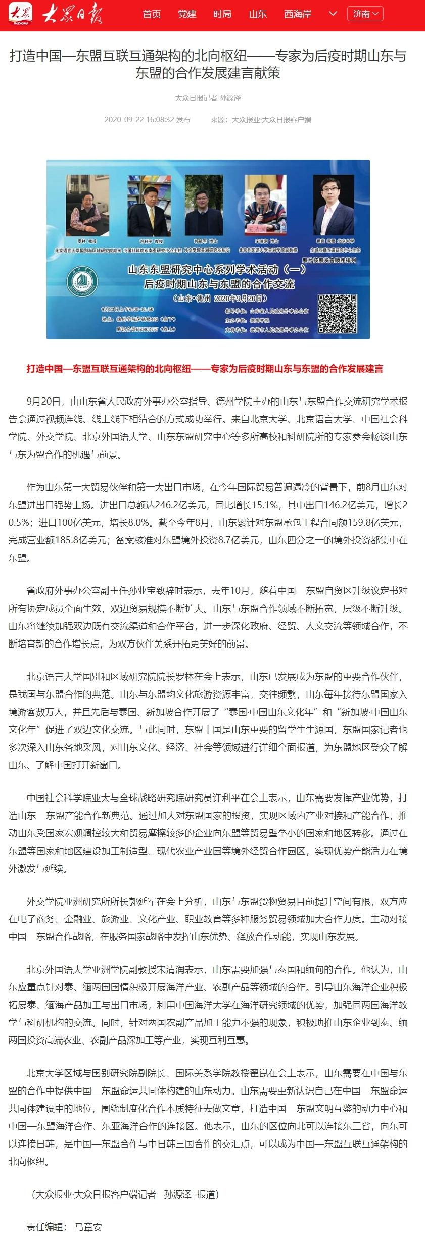 【大众日报】打造中国—东盟互联互通架构的北向枢纽——专家为后疫时期山东与东盟的合作发展建言献策