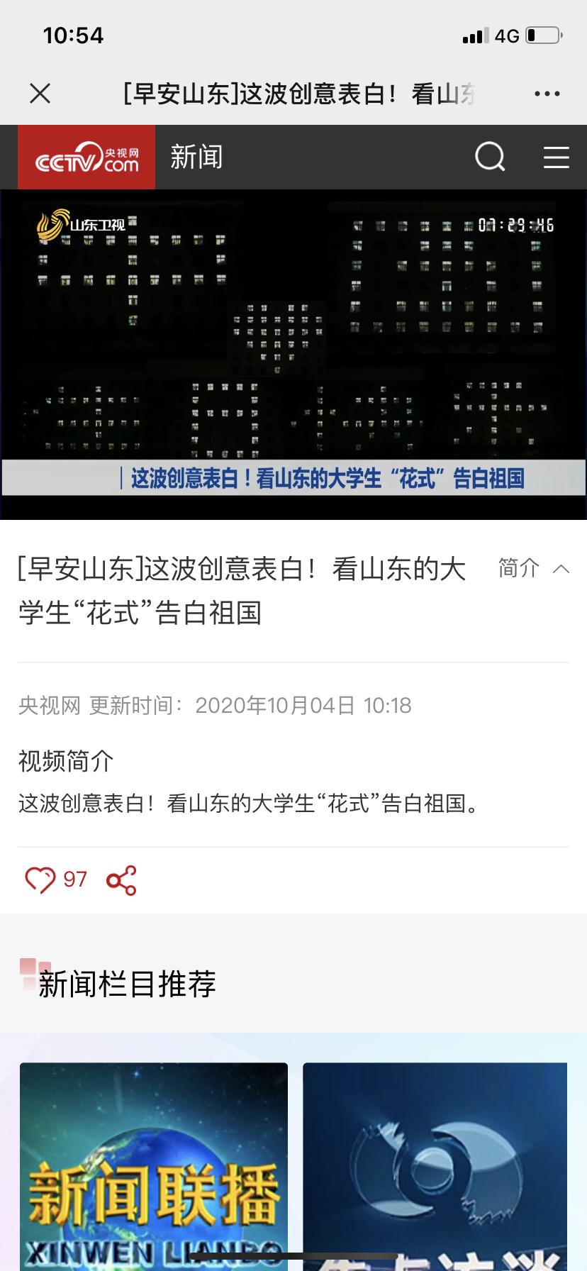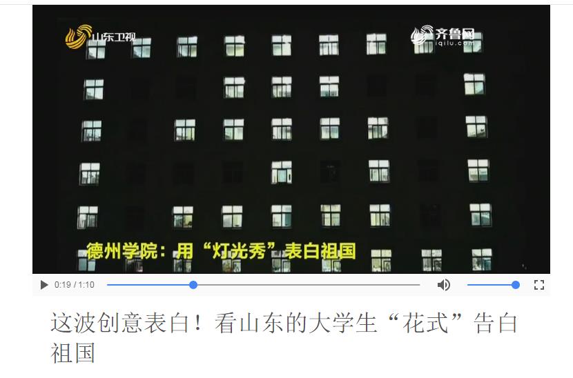 10月3日,央视网、山东卫视、山东广播电视台、齐鲁网、闪电新闻以《这波创意表白!看山东的大学生“花式”告白祖国》为题报道在国庆节即将来临之际,校团委组织青年学生举办了一场别开生面“灯光秀”,向祖国71华诞献礼。