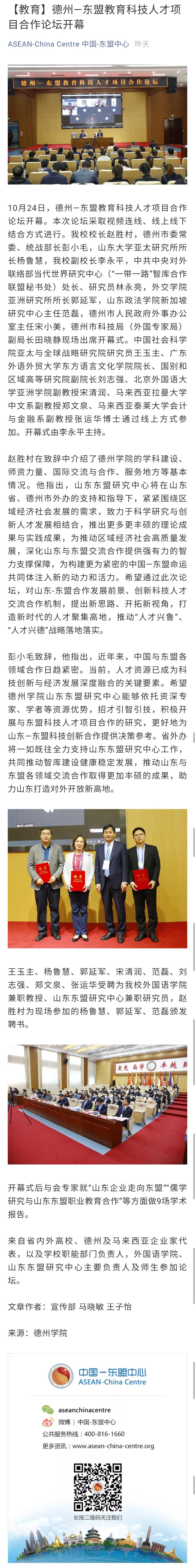 【ASEAN-China Centre 中国-东盟中心】德州—东盟教育科技人才项目合作论坛开幕
