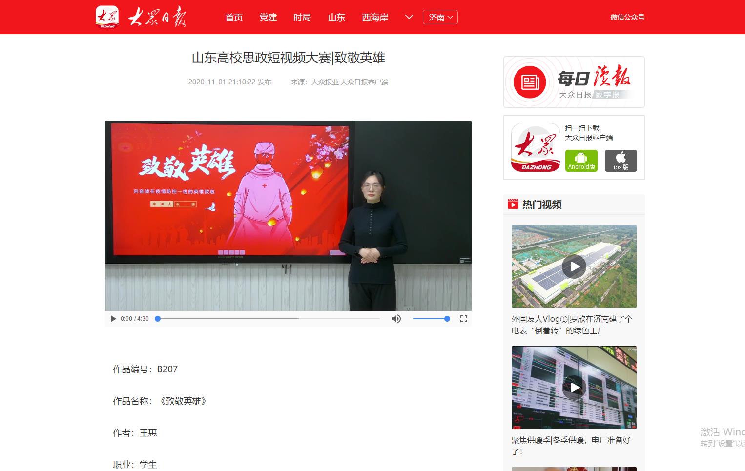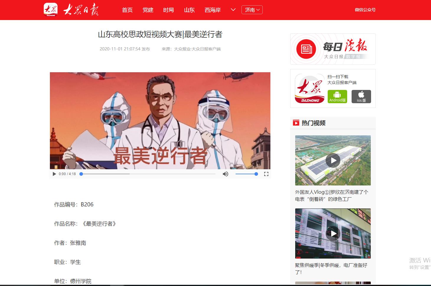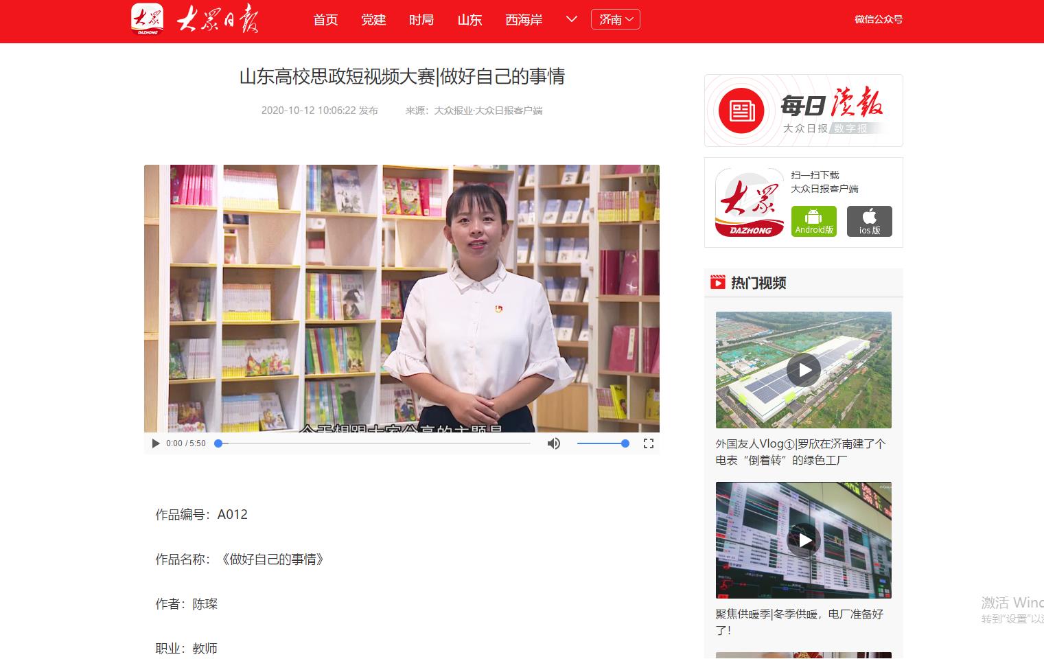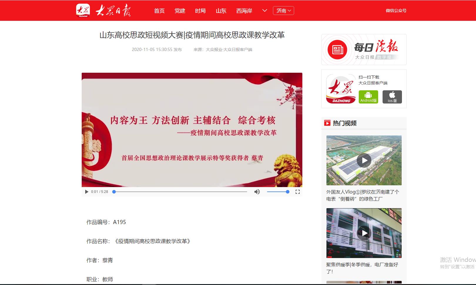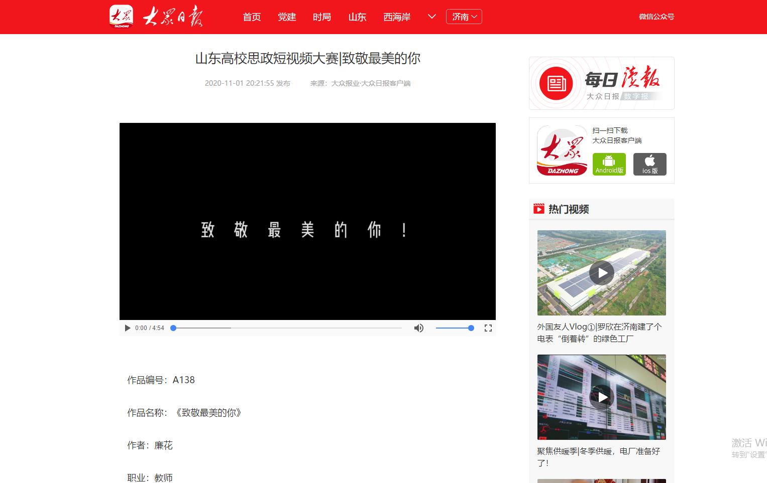为深入学习贯彻习近平总书记在学校思想政治理论课教师座谈会上的重要讲话精神,展示山东高校思政课改革创新成果,促进高校思政工作和思政课教学增强活力,大众日报、山东省教育厅、山东省广播电视局联合主办山东省首届高校思政短视频大赛。今年会党委宣传部、团委积极发动师生投稿,最终蔡青、陈璨、廉花入围教师组,张雅南、王惠入围学生组。