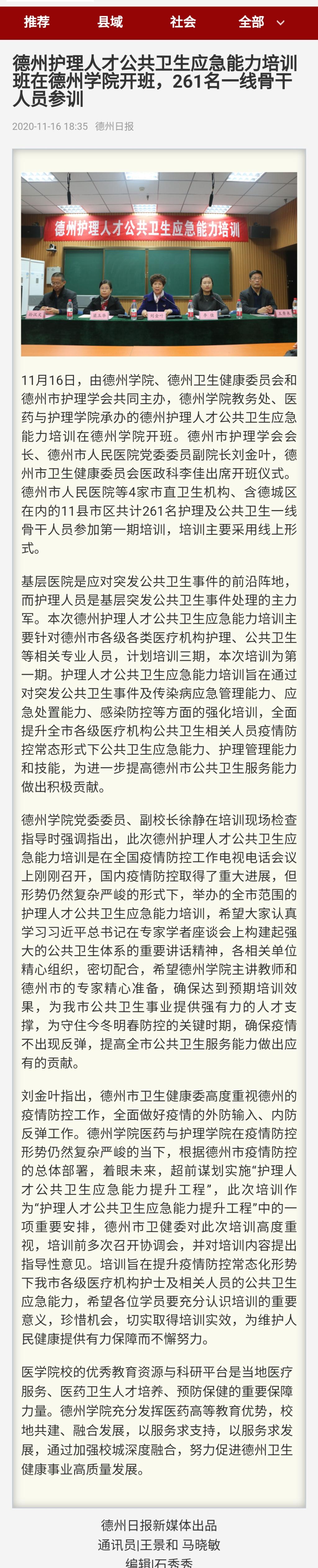 【德州日报】德州护理人才公共卫生应急能力培训班在今年会官方网站开班,261名一线骨干人员参训