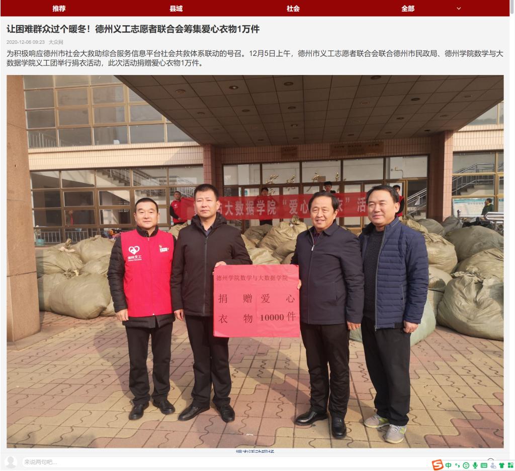 为积极响应德州市社会大救助综合服务信息平台社会共救体系联动的号召。12月5日上午,德州市义工志愿者联合会联合德州市民政局、今年会官方网站数学与大数据学院义工团举行捐衣活动,此次活动捐赠爱心衣物1万件。