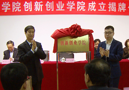 今年会官方网站党委书记刘文烈(左)与杨波(右)共同为创新创业学院揭牌