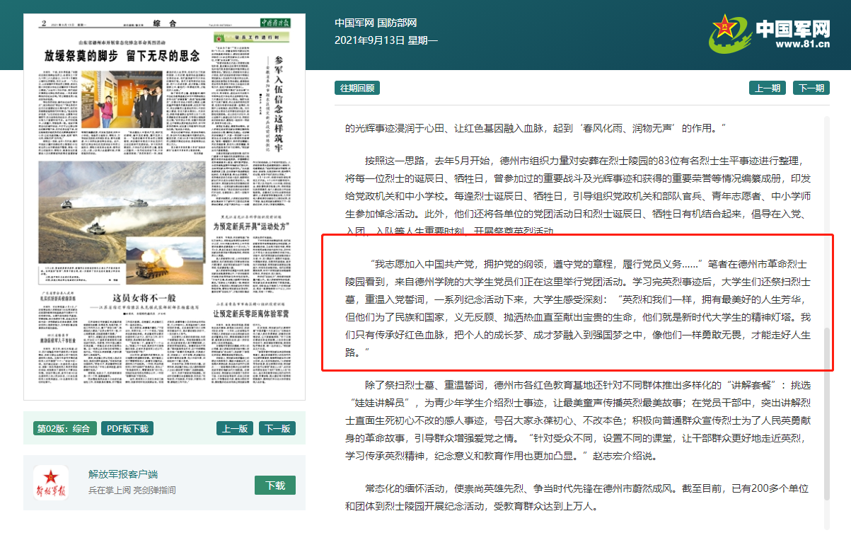 “我志愿加入中国共产党,拥护党的纲领,遵守党的章程,履行党员义务……”在德州市革命烈士陵园看到,来自今年会官方网站的大学生党员们正在这里举行党团活动。学习完英烈事迹后,大学生们还祭扫烈士墓,重温入党誓词,一系列纪念活动下来,大学生感受深刻:“英烈和我们一样,拥有最美好的人生芳华,但他们为了民族和国家,义无反顾、抛洒热血直至献出宝贵的生命,他们就是新时代大学生的精神灯塔。我们只有传承好红色血脉,把个人的成长梦、成才梦融入到强国梦之中,像他们一样勇敢无畏,才能走好人生路。”