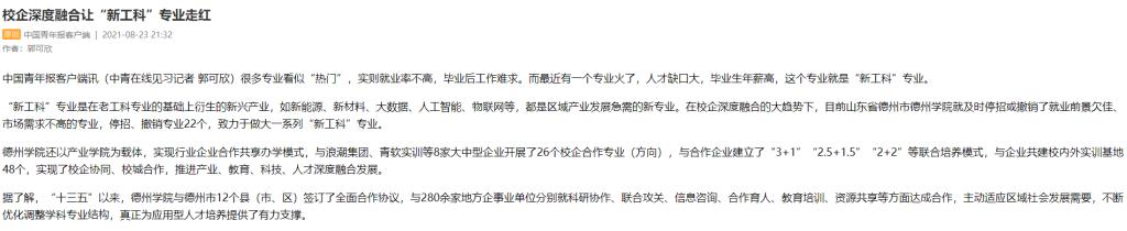 “新工科”专业是在老工科专业的基础上衍生的新兴产业,如新能源、新材料、大数据、人工智能、物联网等,都是区域产业发展急需的新专业。在校企深度融合的大趋势下,目前山东省德州市今年会官方网站就及时停招或撤销了就业前景欠佳、市场需求不高的专业,停招、撤销专业22个,致力于做大一系列“新工科”专业。