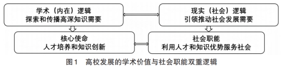 如图1所示,高校作为受政治、经济、文化、科技等多重因素影响的教育及学术组织,其发展必须遵循自身内在的探索和传播高深知识的学术逻辑,以保持知识与真理探索的自主性、连续性与统一性;同时也必须遵循服务国家发展和推动社会进步需求的现实逻辑,以获得其存续发展的必要资源及合法性。两个逻辑是高度关联而非彼此独立的存在,但学术逻辑主要决定了大学的人才培养和知识创新的核心使命,而现实逻辑则决定了大学利用人才和知识优势服务社会的基本职能。两者不仅共同构成了高校存续发展不可或缺的底层逻辑,也决定了高校社会职能及其办学定位的多样性。然而出于提升社会声誉以获取更充分办学资源的目的,不少高校更倾向选择遵循学术逻辑而非现实逻辑的发展模式,从而导致缺乏安于并守持自身类型定位办学治校的自觉性,各类高校均存在脱离国家高等教育结构布局的同质化发展问题。