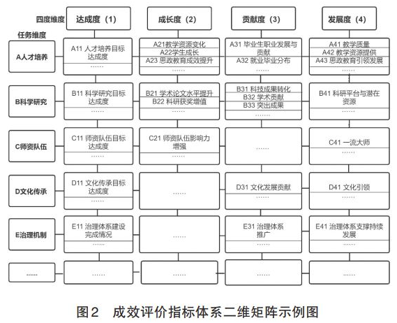 建设任务维度:人才培养={思政特色教育成效(达成、成长、发展……),教学资源(达成、发展……),教学资源与质量(达成、成长、贡献……),学生学习成果(达成、成长、贡献……),毕业生职业发展与社会贡献(达成、成长、贡献……),……};同样如科学研究={学术发表水平(达成、成长、贡献……),成果转化(达成、成长、贡献……),科研成果(达成、成长、贡献……),科研平台(发展……),……}。
