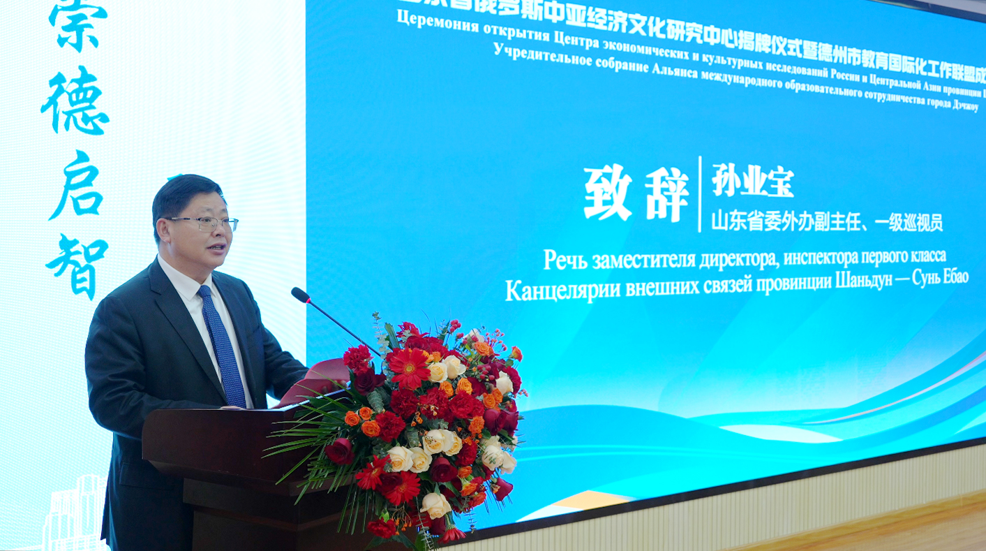 孙业宝致辞,他说,山东省俄罗斯中亚经济文化研究中心和德州市教育国际化工作联盟必将相得益彰,为开展前沿经济文化研究和权威信息咨询提供有力支撑,进一步助力山东打造高水平对外开放新高地。未来,省委外办也将继续秉持开放、合作、共赢的理念,加强沟通协调,优化外事环境,为中心和联盟的发展提供更多支持,推动促成与俄罗斯、中亚国家更多国际合作项目落地,为服务周边外交大局贡献山东力量。