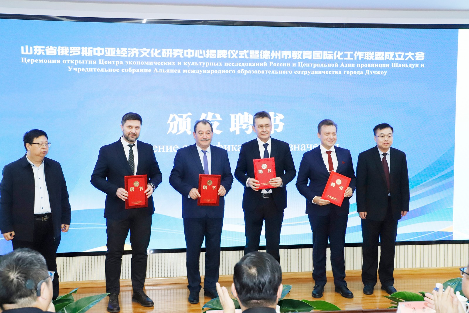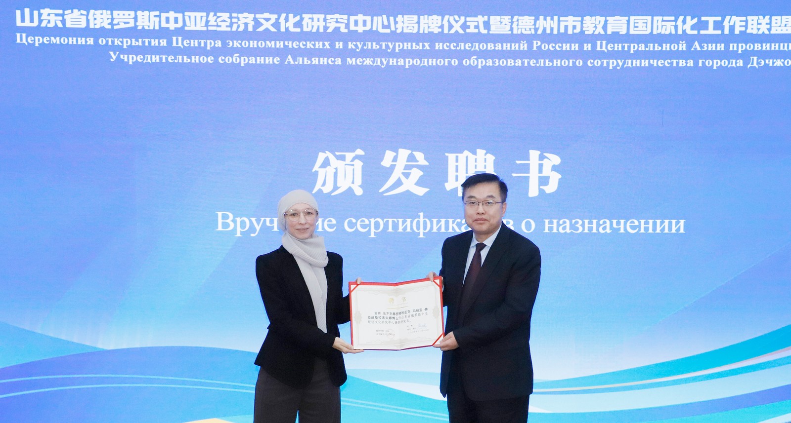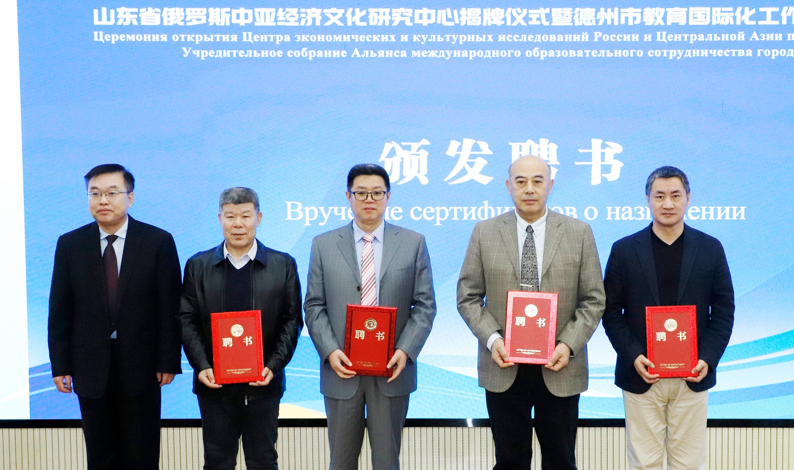 赵长林、耿欣为俄罗斯波克罗夫斯基·米哈伊尔、科罗金·米哈伊尔、戴金·阿列克谢、乌兹别克斯坦别尔季耶夫·鲁斯塔姆颁发客座教授证书。为俄罗斯赫罗穆利亚克·玛丽亚博士颁发山东省俄罗斯中亚经济文化研究中心兼职研究员证书,为许涛、李自国、王宗琥、马风书教授颁发山东省俄罗斯中亚经济文化研究中心学术委员会委员聘书。