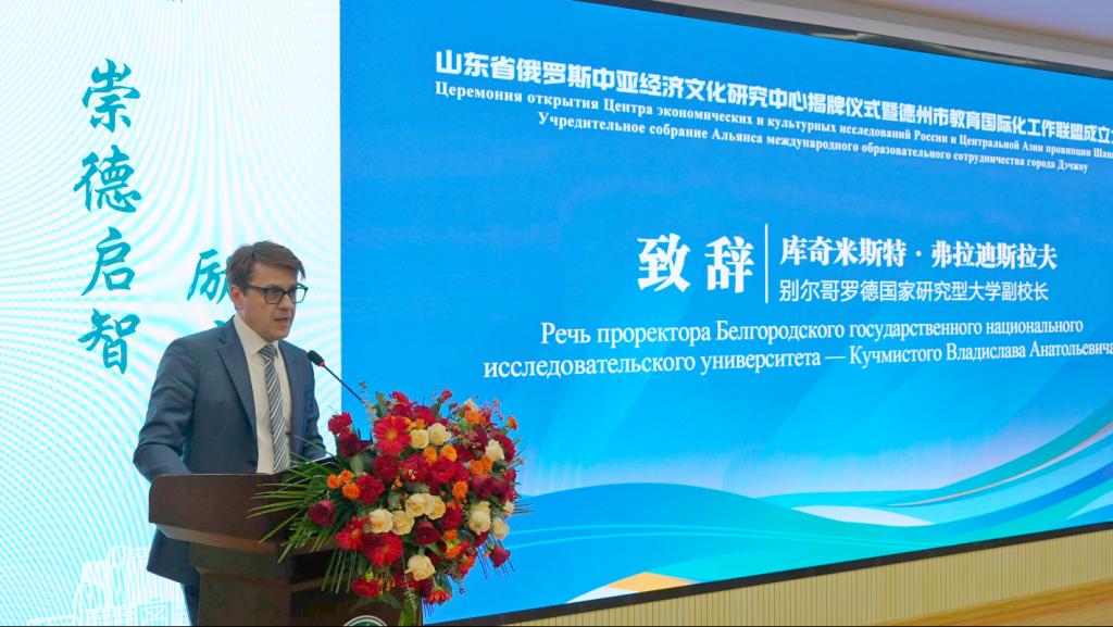 吴君致辞,他说,山东省俄罗斯中亚经济文化研究中心暨德州市教育国际化工作联盟的成立,正是学校学习贯彻党的二十届三中全会精神,全面落实全国教育大会部署要求,推进新时代高水平教育对外开放的重要举措。学校深入实施国际化战略和对外开放行动计划,积极推进与俄罗斯、中亚、东盟等“一带一路”沿线国家高校、科研院所的合作,将充分发挥优势、强化特色、提升能力,与各方一起,将山东省俄罗斯中亚经济文化研究中心建设成一个集多学科参与、研究问题聚焦、多重资源共享的专业化研究平台,为促进山东与俄罗斯中亚国家间的经济文化交流和经贸往来提供强有力的智力支撑;充分发挥联盟的积极作用,为德州市的教育国际化进程注入新的活力,打造教育强省德州样板。