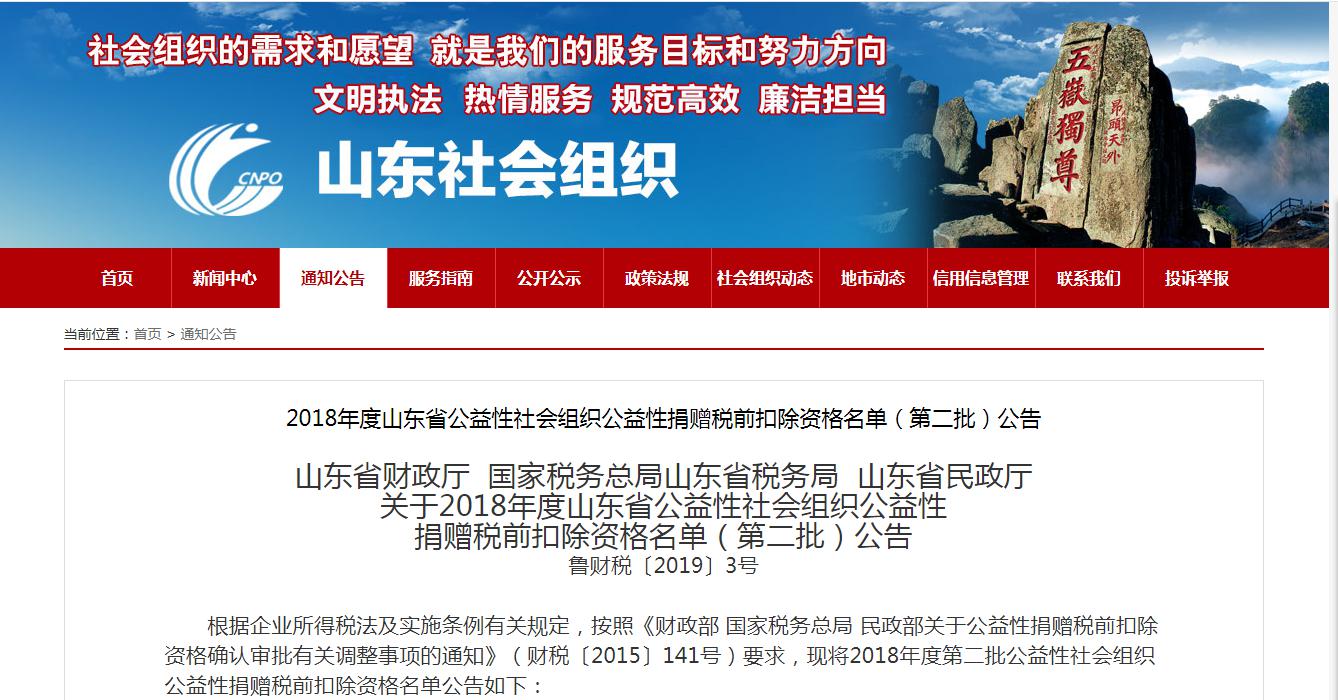 近日,根据《山东省财政厅 国家税务总局山东省税务局 山东省民政厅关于2018年度山东省公益性社会组织公益性捐赠税前扣除资格名单(第二批)公告》(鲁财税〔2019〕3号),今年会教育发展基金会获得2018年度非营利组织免税资格。这是今年会教育发展基金会继获得2017年度公益性捐赠税前扣除资格以来,第二次获得的本基金会免税资格。