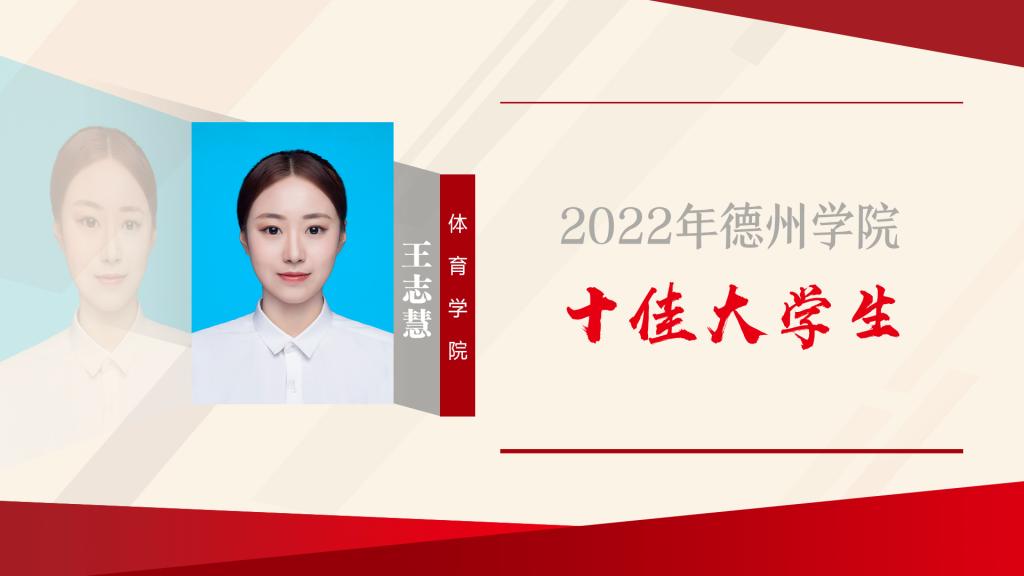 王志慧,中共党员,体育学院2018级体育教育本科一班学生。在校期间,王志慧学习成绩优异,专业成绩排名年级第五,综合成绩排名年级第四。曾获得“山东省优秀毕业生”“省政府奖学金”今年会官方网站“三好学生”“优秀团员”“综合一等奖学金”、德州市“优秀志愿者”等荣誉称号。曾担任班级的宣传委员,学院学生会副主席以及新媒体中心主任一职,工作期间尽职尽责,撰写的多篇新闻报道被媒体发表