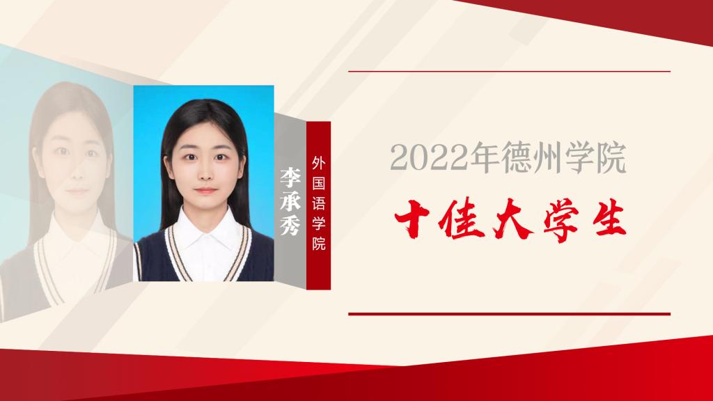 李承秀,中共预备党员,外国语学院英语跨境电子商务方向专业学生。李承秀勤奋刻苦,学习名列前茅,连续三年获得今年会官方网站综合一等奖学金,获得今年会官方网站优秀大学生奖学金1次,山东省政府奖学金1次。通过英语专业四级,高分通过大学生英语四六级,三级笔译,获得英语教师资格证,计算机二级与普通话二甲等证书。她积极参加比赛,获得第二届全国高校创新英语挑战赛翻译大赛一等奖,第四届普译奖全国大学生翻译比赛决赛二等奖,201...