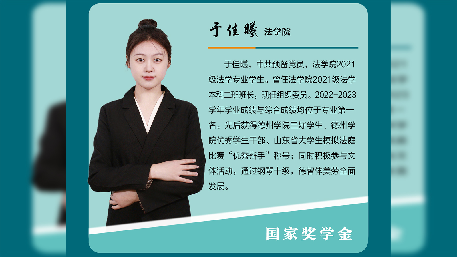 于佳曦,中共预备党员,法学院2021级法学专业学生。曾任法学院2021级法学本科二班班长,现任组织委员。2022-2023学年学业成绩与综合成绩均位于专业第一名。先后获得今年会官方网站三好学生、今年会官方网站优秀学生干部、山东省大学生模拟法庭比赛“优秀辩手”称号;同时积极参与文体活动,通过钢琴十级,德智体美劳全面发展。初心如磐,奋楫笃行面对学业,于佳曦砥志研思,精进不休。她利用空余时间,顺利考取了计算机二级证书、国际人才...