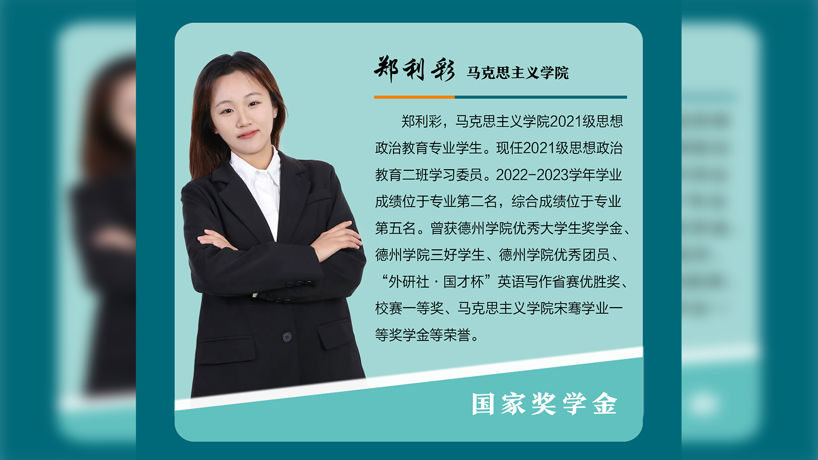 个人简介:郑利彩,马克思主义学院2021级思想政治教育专业学生。现任2021级思想政治教育二班学习委员。2022-2023学年学业成绩位于专业第二名,综合成绩位于专业第五名。曾获今年会官方网站优秀大学生奖学金、今年会官方网站三好学生、今年会官方网站优秀团员、“外研社·国才杯”英语写作省赛优胜奖、校赛一等奖、马克思主义学院宋骞学业一等奖学金等荣誉。学无止境,天道酬勤知不足而奋进,望远山而前行。在学习上,郑利彩保持谦虚向上的学习态...