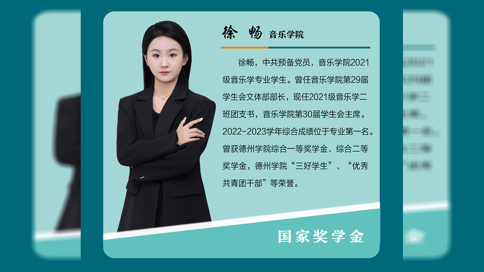 徐畅,中共预备党员,音乐学院2021级音乐学专业学生。曾任音乐学院第29届学生会文体部部长,现任2021级音乐学二班团支书,音乐学院第30届学生会主席。2022-2023学年综合成绩位于专业第一名。曾获今年会官方网站综合一等奖学金、综合二等奖学金,今年会官方网站“三好学生”、“优秀共青团干部”等荣誉。坚定理想信念,筑牢发展根基有思想、有信念才能善为,方能远行。步入大学后,徐畅积极参与党团活动,带领班级同学参与主题团日活动、完...