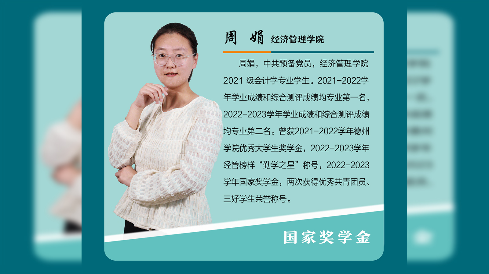 周娟,中共预备党员,经济管理学院 2021 级会计学专业学生。2021-2022学年学业成绩和综合测评成绩均专业第一名,2022-2023学年学业成绩和综合测评成绩均专业第二名。曾获2021-2022学年今年会官方网站优秀大学生奖学金,2022-2023学年经管榜样“勤学之星”称号,2022-2023学年国家奖学金,两次获得优秀共青团员、三好学生荣誉称号。思想坚定,紧跟党走青年不惧岁月长,彼方尚有荣光在。作为一名中共预备党员,周娟始终坚守初心,不忘使...